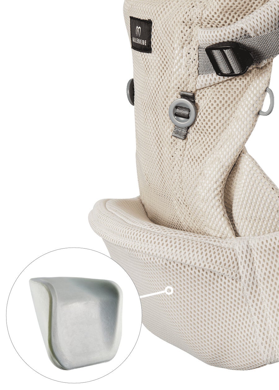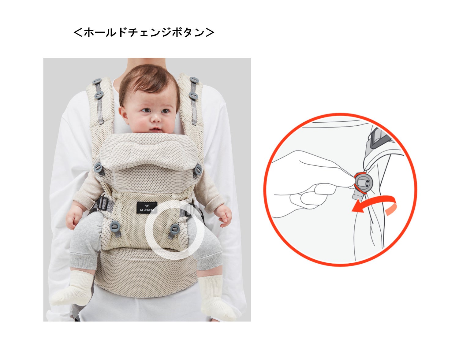 シートの幅を2段階で調節できる「シートアジャストメント」機能により、自然なM字姿勢をキープしてお子様を抱っこできる。また、前向き抱っこの際は前面カバーの「ホールドチェンジボタン」を使用することで、自然な脚の開きに合った幅に調節可能