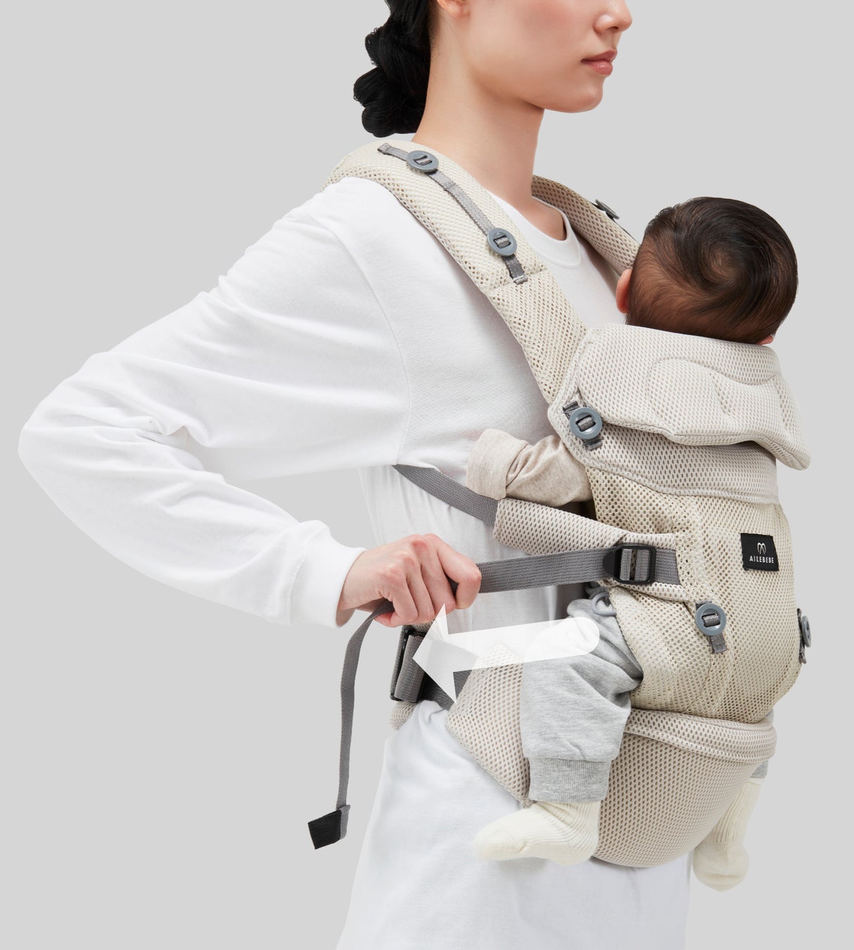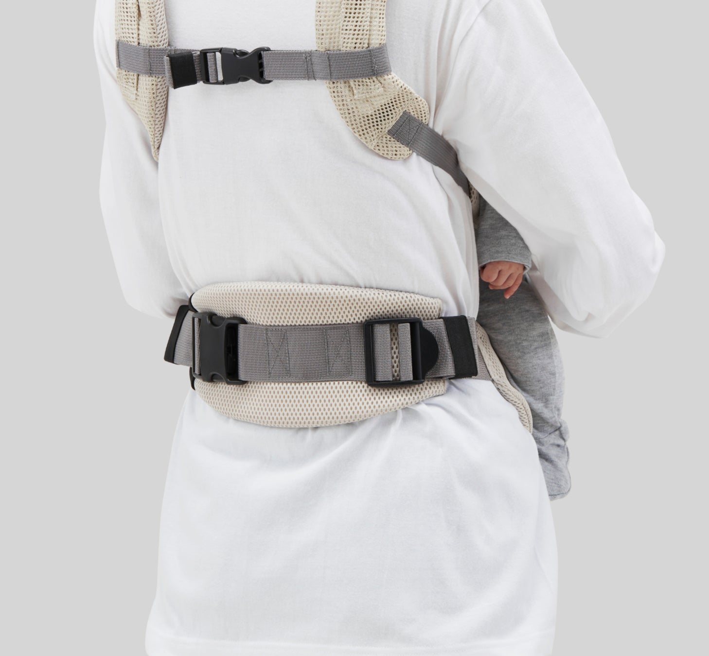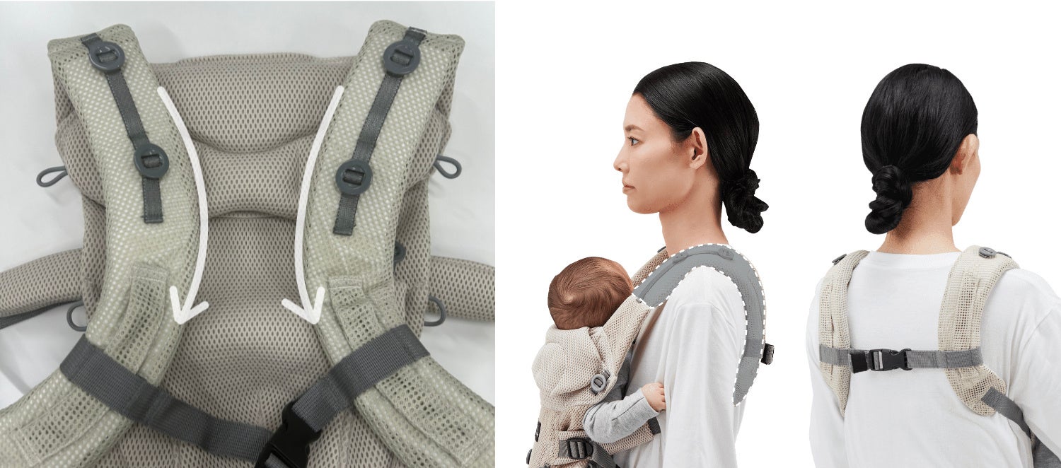 肩ストラップはお子様を抱っこした状態でもスムーズに長さ調節ができるよう、アジャスターを前方に設置。自然な動作で調節できるため、身体にフィットさせやすい
