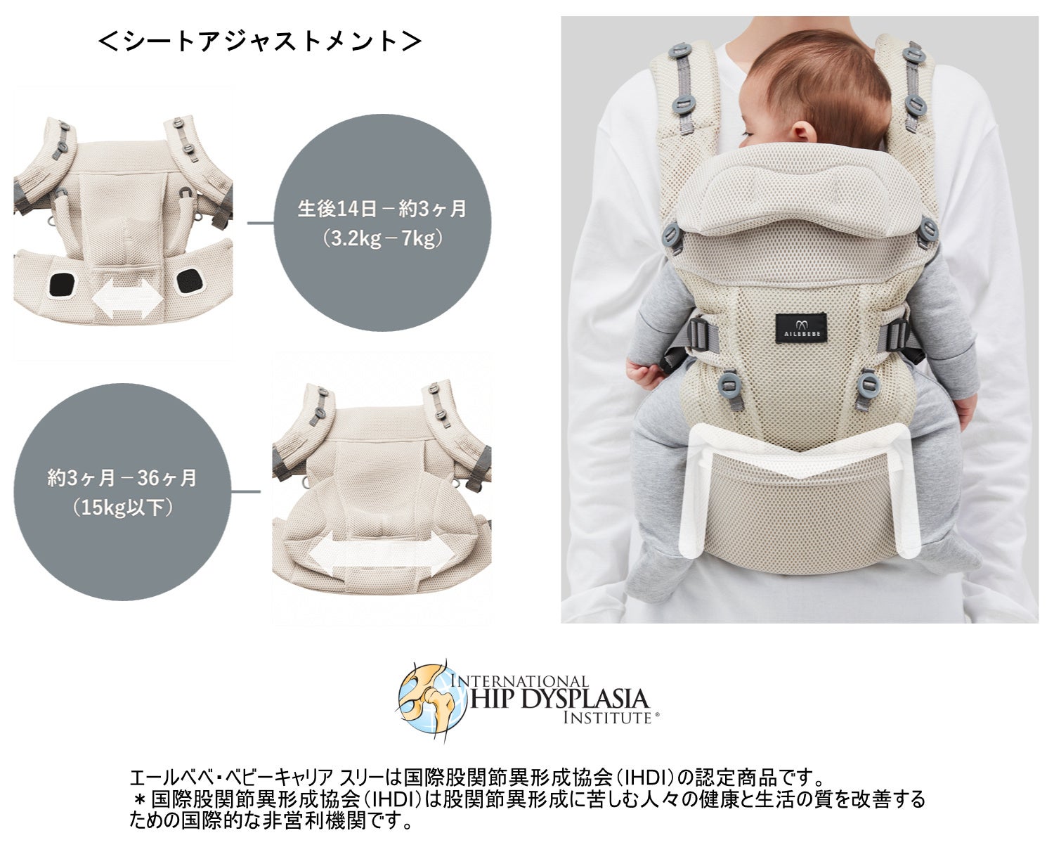 ・安全認証等:SGマーク制度の認定製品※、EN規格適合(EN 13209-2:2015)、国際股関節異形成協会認定(IHDI)