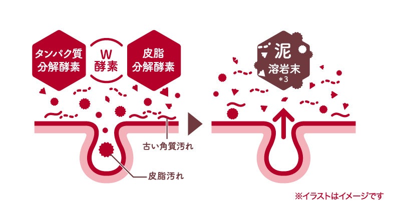 落としにくかった大人の角栓を「W酵素*1」で芯※1から落とし、「赤いビタミン*2」でゆらぎやすい大人の肌荒れを防いで透明無垢肌へと導きます。お肌も気持ちもリフレッシュできるような、フレッシュでキュートなレッドベリーの香りつき。