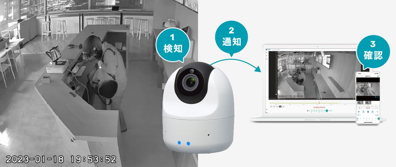 スタッフが退店した後の時間帯(夜間~早朝)に通知設定を行い、出入口など人が立ち入った場合に通知をメールで受け取ることができます。また、人が立ち入らない時間帯に通知設定を行い、金庫前に人が侵入したケースにも対応が可能です。