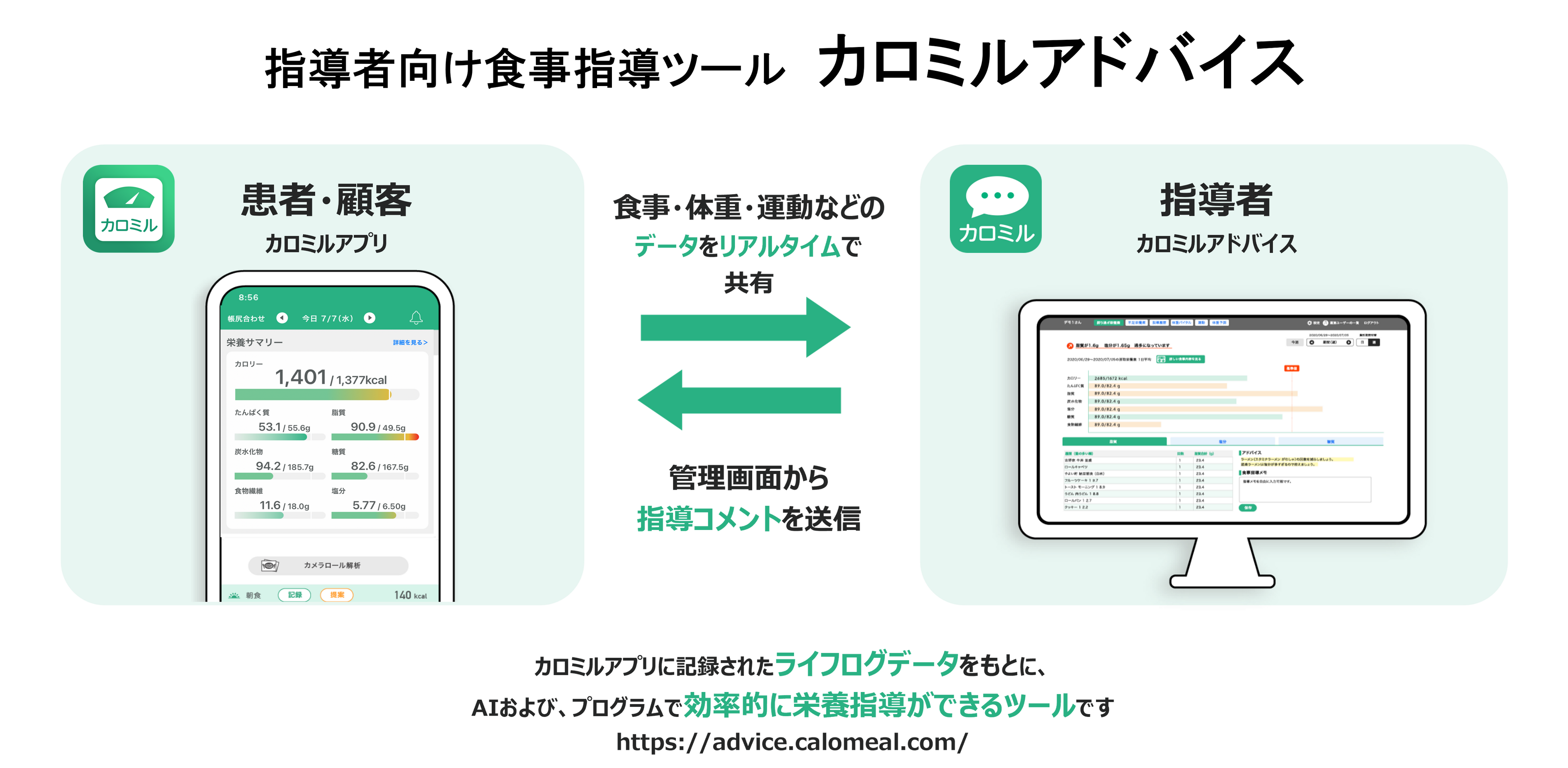 当社が開発する「カロミル」は、写真1枚で毎日の食事を記録し、AI(人工知能)の画像解析技術によって自動で栄養価を割り出し登録できる食事・運動・体重管理アプリです。また「カロミルアドバイス」は、指導対象者(顧客)の「カロミル」アプリと連携し、食事や栄養指導がすべてオンライン上で完結できる、指導者向けのウェブツールとなっています。