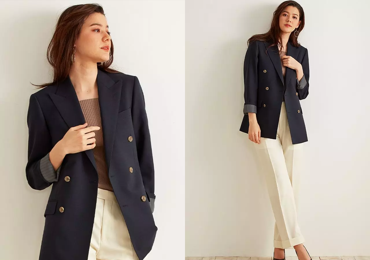定番のテーラードジャケットをよりスタイリッシュにアレンジしたモデル。深めのVゾーンが優美でエレガントなラインを演出してくれます。さらにシェイプされたウエストラインですっきりシャープな印象を与えます。※もちろんお好みで調整可能です。