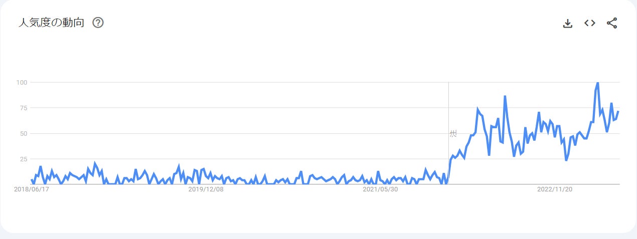 下のグラフは、2018年6月から2023年6月までの、『ビジネスカジュアル』というキーワードをネット検索したユーザー数の推移を示した『Google トレンド』のグラフです。2021年の12月から爆発的に増加傾向にあります。