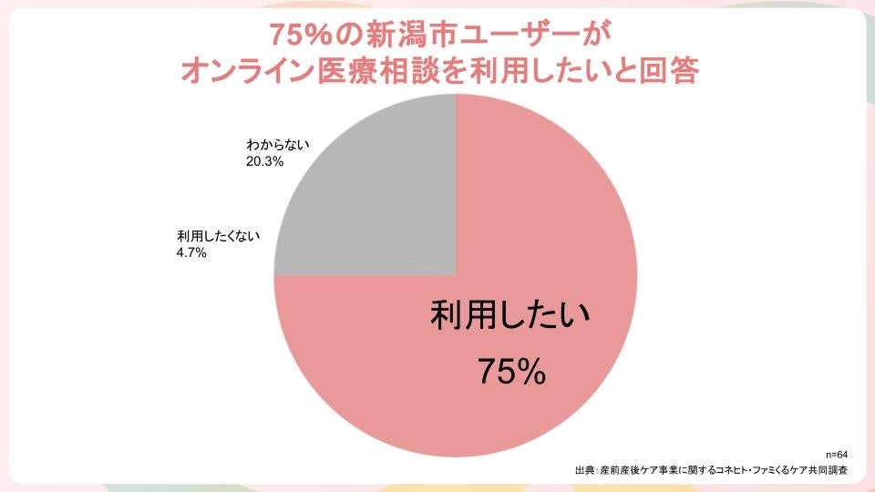 新潟県にお住まいの妊娠~子育て中の母親を対象としたコネヒト・ファミくるケアの調査によると、最も信頼できる相談先として家族に次いで医療機関・助産師が選ばれ、7割を超える新潟市在住のユーザーが「オンライン医療相談を利用したい」と回答し、専門家へのオンライン相談のニーズが高いことが分かりました。
