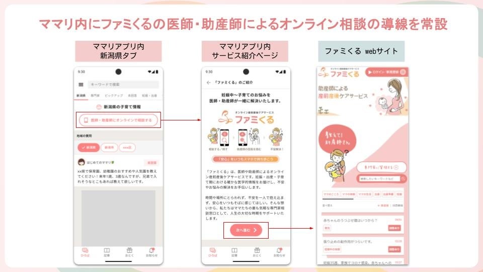 そこで、母親同士の相談場所として日常使いする「ママリ」に、医師や助産師に24時間オンライン相談できる「ファミくる」への導線を新潟市在住のユーザーを対象に設置いたします。