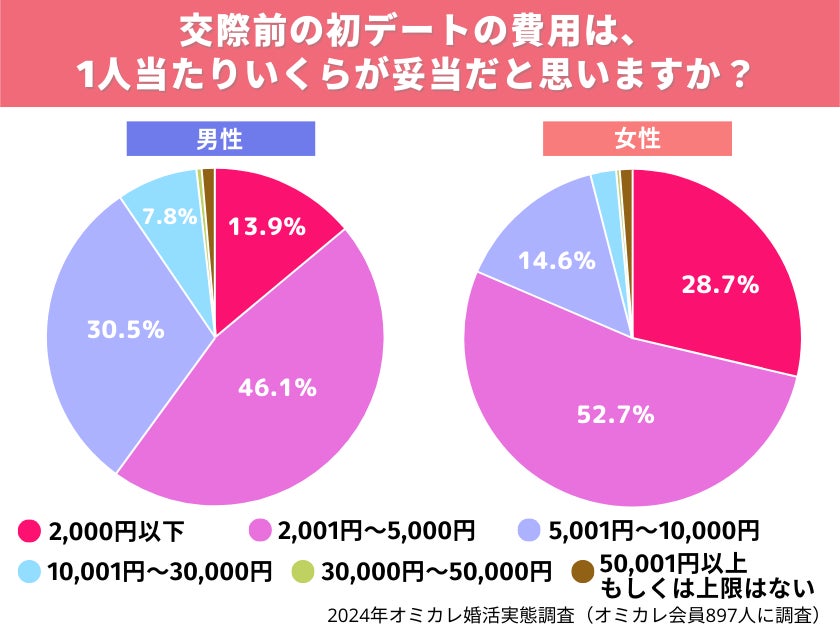 次いで「5,0001~10,000円」との回答が約24%となっており、男性の多くが交際前の初デートでは全額・多めに費用を負担しようと考えているのがわかる結果となりました。
