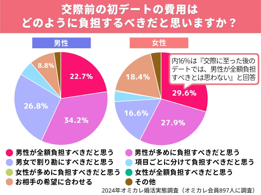 しかし、「男性が全額負担すべき」と回答した女性の16%は、「交際後のデートでは、男性が全額負担すべきとは思わない」と回答しています。