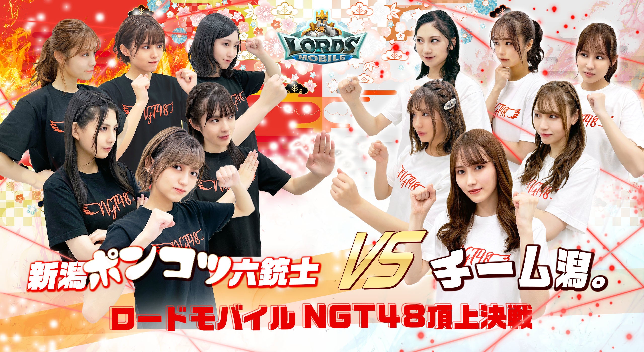 『ロードモバイル』は、全世界4.4億ダウンロードされている世界同時対戦RPGゲーム。今回はNGT48より12名のメンバーが参加。「新潟ポンコツ六銃士」VS「チーム潟。」という構図で、それぞれのメンバーが最大100名のギルドを作り、同じギルドでファンと協力しながら一緒にゲームをプレイする。ロードモバイル内のイベント「ギルド共闘」で勝敗を決定。優勝はどちらのチームの手に!?