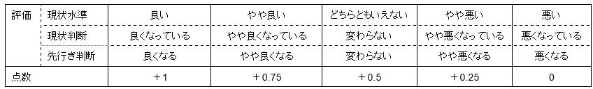 調査客体から収集した判断内容を下表のとおり点数化し、その平均値を最低0点から最大100点となる指数(Diffusion Index、DI)として示しています。そのため、この指数では50より大きいほど「購買意欲が強い」、小さいほど「購買意欲が弱い」と判断されていることになります。