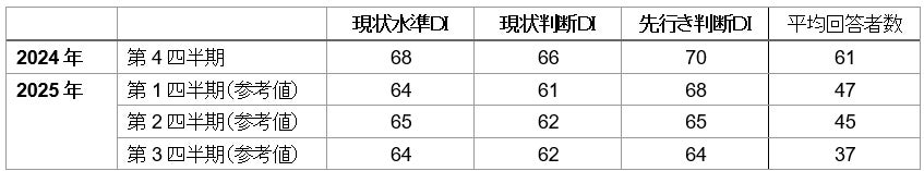 ・先行き判断DIは、前四半期差で-1ポイントの64と横ばいであった。