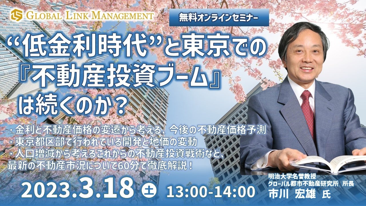 投資用不動産を扱う株式会社グローバル・リンク・マネジメント(本社:渋谷区、代表取締役:金大仲、証券コード:3486、以下「GLM」)は、明治大学名誉教授 市川宏雄氏が登壇するセミナー「“低金利時代”と東京での『不動産投資ブーム』は続くのか?」を2023年3月18日(土)にオンライン形式で開催いたします。