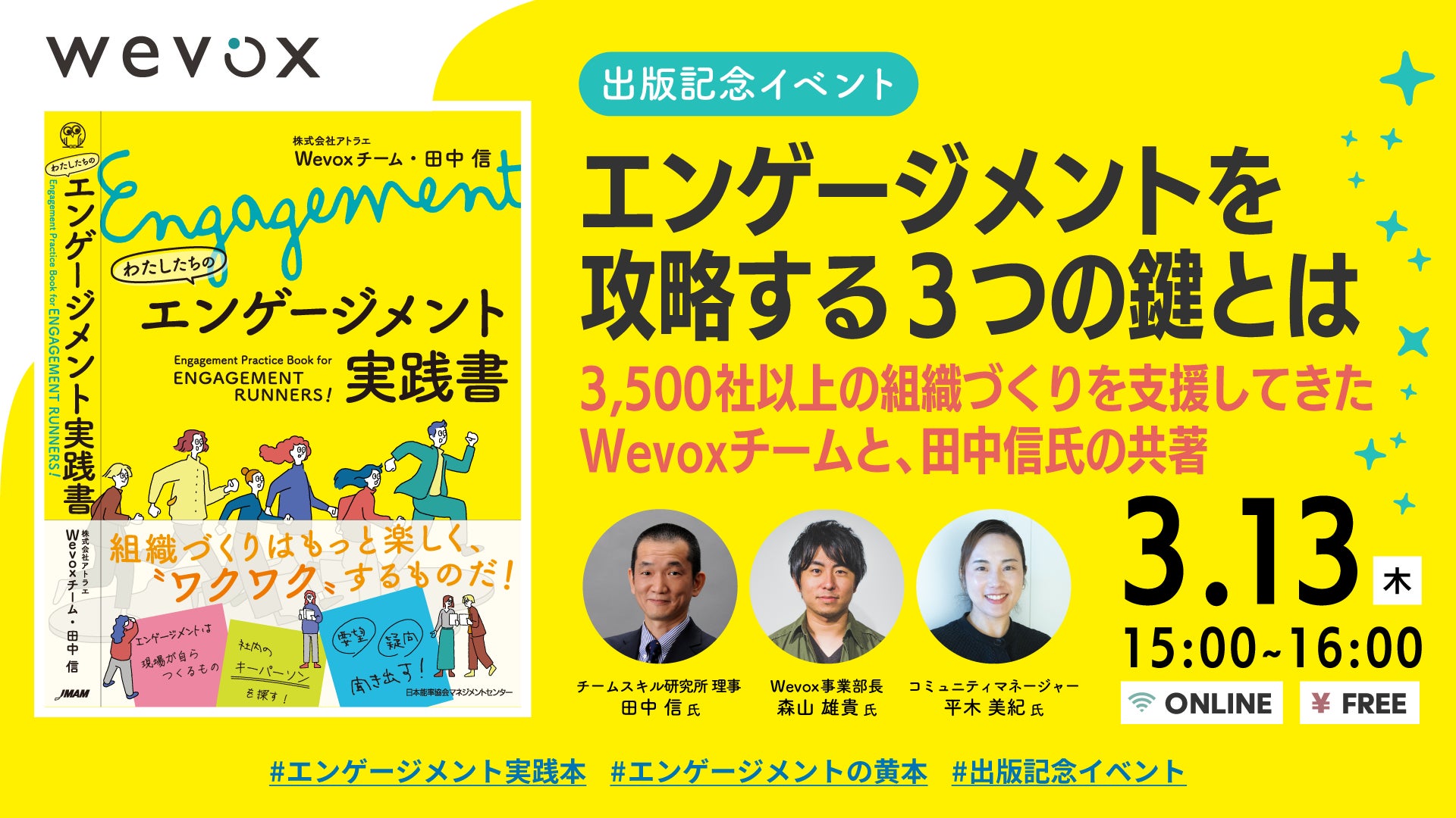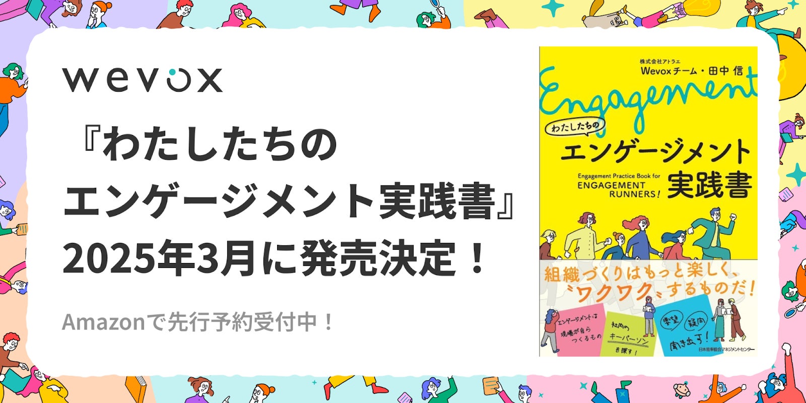 People Tech (テクノロジーによって人の可能性を拡げる) 事業を展開する株式会社アトラエ(本社:東京都港区、代表取締役CEO:新居佳英、東京証券取引所プライム市場:6194、以下 アトラエ)は、組織力向上プラットフォーム「Wevox(ウィボックス)」の実践知を元にした書籍『わたしたちのエンゲージメント実践書』の発売決定をお知らせします。本書は2025年3月3日(月)より発売で、Amazon、楽天ブックス、ネット書店等ではすでに先行予約受付中です。