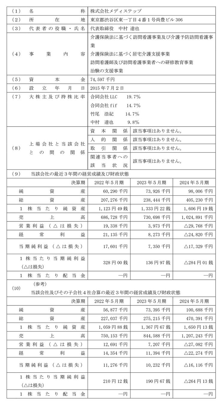 (注)当該会社は連結指標がないため、当該会社、当該会社の子会社である株式会社ケアフル、株式会社てとて、株式会社AKN及び株式会社ジョイの単体指標を単純合算した数値を(10)に記載しております。なお、当該会社の子会社4社は2025年1月にメディステップを存続会社とする吸収合併を行っております。