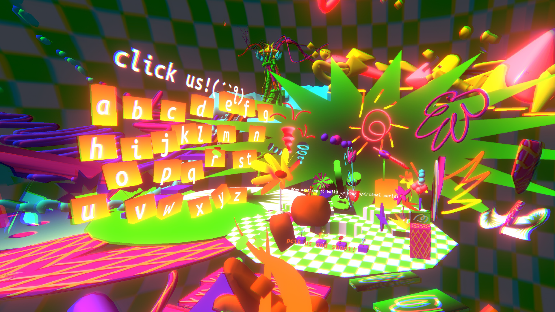 私たちはあらゆる種類の規則で縛られた時間の中で暮らしています。常に無意識のうちに「できない」、「しなくては」といった規則で想像を制限し、次第に内向きで平凡になります。私たちはいつも他人の感覚を考え、社会によって与えられた先入観やレッテルに合うかどうか常に悩んでいます。でも、完全に自分のスペースはどこにあるのでしょうか?自分自身と呼べる場所はまだ持てるでしょうか?この仮想世界では、部外者には「異常」と思えますが、表向きの仮面の下に少しの真実と単純さを保ちつつ、私自身の想像空間の構築を楽しみたいと思います。 この世界では、頭の中にあるイメージを作るため、ものをドラッグアンドドロップできます。脱構築主義的な抽象的な点と線および比喩的な文字が多数あり、表現したい言語や楽しめるダイナミックな植物園を作れます。また、銃が5丁あるので、発射する弾丸を選び、あなたの世界を構築するための材料に使えます。要するに、制約のない空想世界にしたいのです。