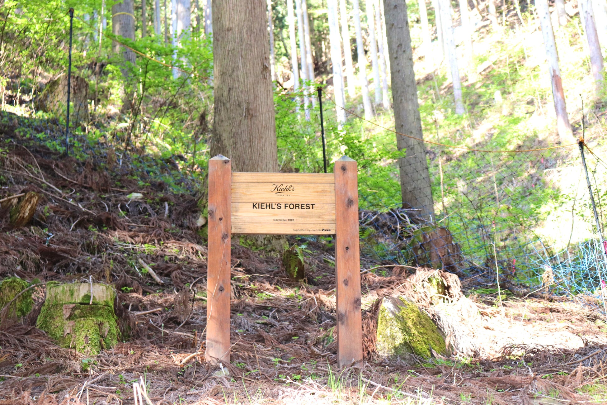 キールズの森は2020年より活動をスタートしました。適切な植林や間伐をすることで様々な種類の木々が共生する「多様性のある森づくり」に取り組んできました。西日本有数の林業地として名を馳せ350年以上の植林の歴史をもつ鳥取県智頭町に位置しています。既存のスギ人工林を活かしながら、針葉樹と広葉樹がミックスした混交林を目指しています。木材として価値の高い樹種や、食用になる樹種など、智頭町に自生する樹種から選び植栽しています。また、間伐を行い、地表まで太陽の光が届くようになり、下層植生が豊かになります。間伐された木を木材として利用することで、その利益を森づくりに還元できます。例えば、キールズが所属する日本ロレアルのオフィスでは、シェルフやウッドチップに智頭町のスギ材やヒノキ材を用いています。