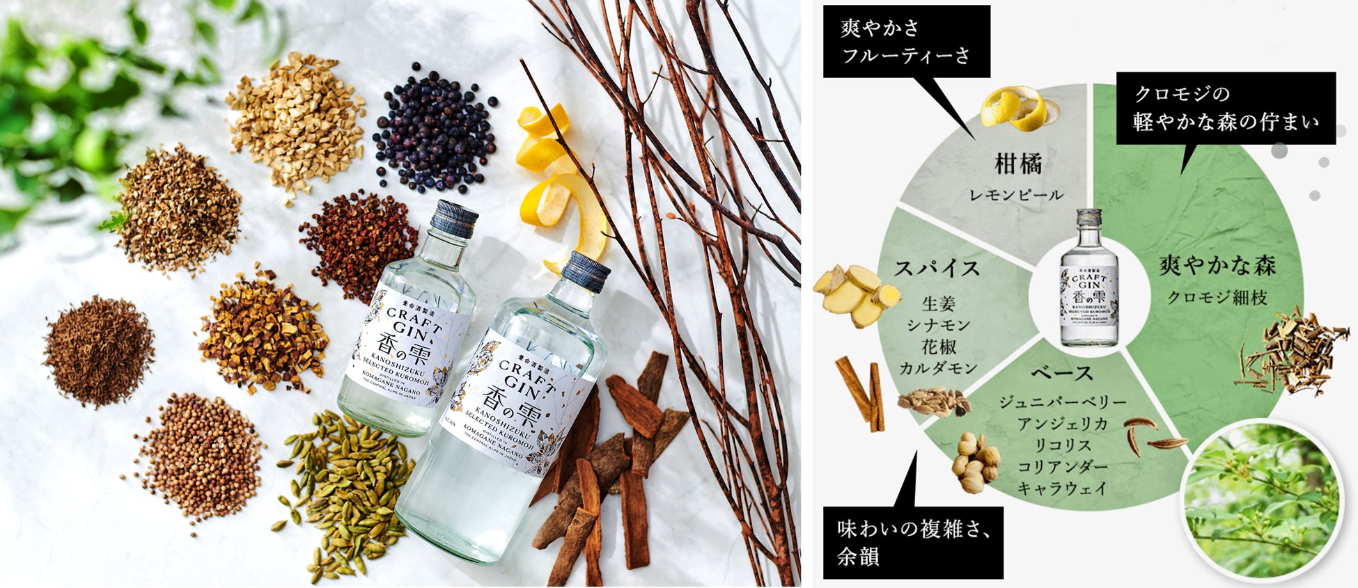 日本の新緑の森のような、繊細でいて軽やかな風味を味わっていただくために、クロモジの細枝のみを加えて蒸留した液と、その他のボタニカルを蒸留した液をブレンドする独自の製法を追求。クロモジの特徴的な香りと味わいを引き出し、個性的な風味が生まれました。