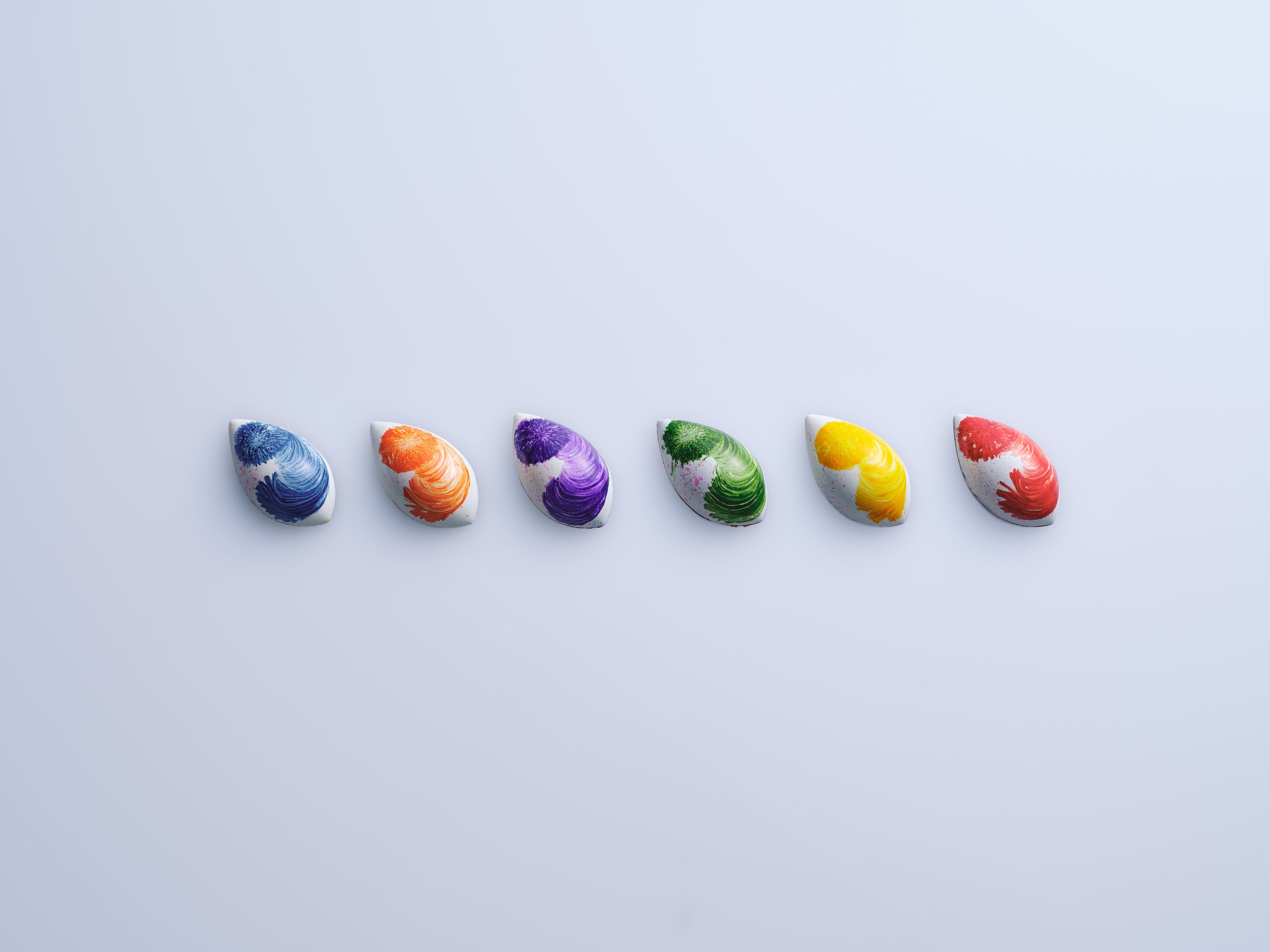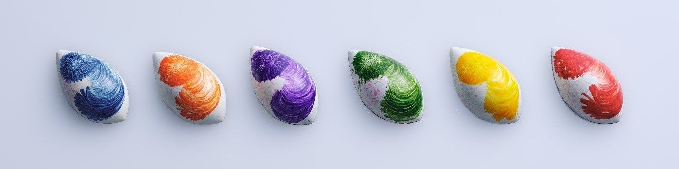 レ×柚子」、「エルダーフラワー×レモン」、「カモミール×オレンジ」、「ローズ×ストロベリー」など、計6種類の味でお楽しみいただけます。ブルー、オレンジ、パープル、グリーン、イエロー、レッドの鮮やかなフラワーデザインを纏い、ペストリーシェフが花言葉のメッセージを込めました。