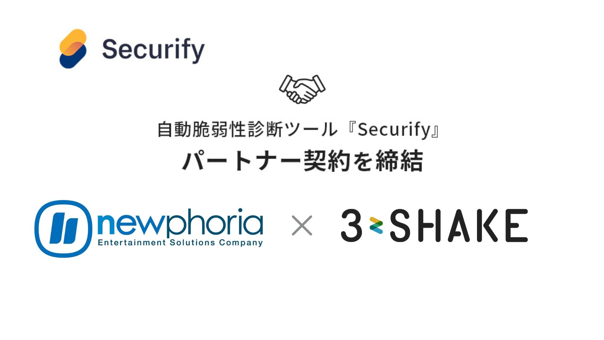 株式会社スリーシェイク(本社:東京都新宿区、代表取締役社長:吉田 拓真、以下スリーシェイク)は、株式会社ニューフォリア(本社:東京都渋谷区、代表取締役社長:多田 周平、以下ニューフォリア)と、手軽に社内でセキュリティ診断を実施できる自動脆弱性診断ツール「Securify(セキュリファイ)」において、パートナー契約を締結したことをお知らせします。