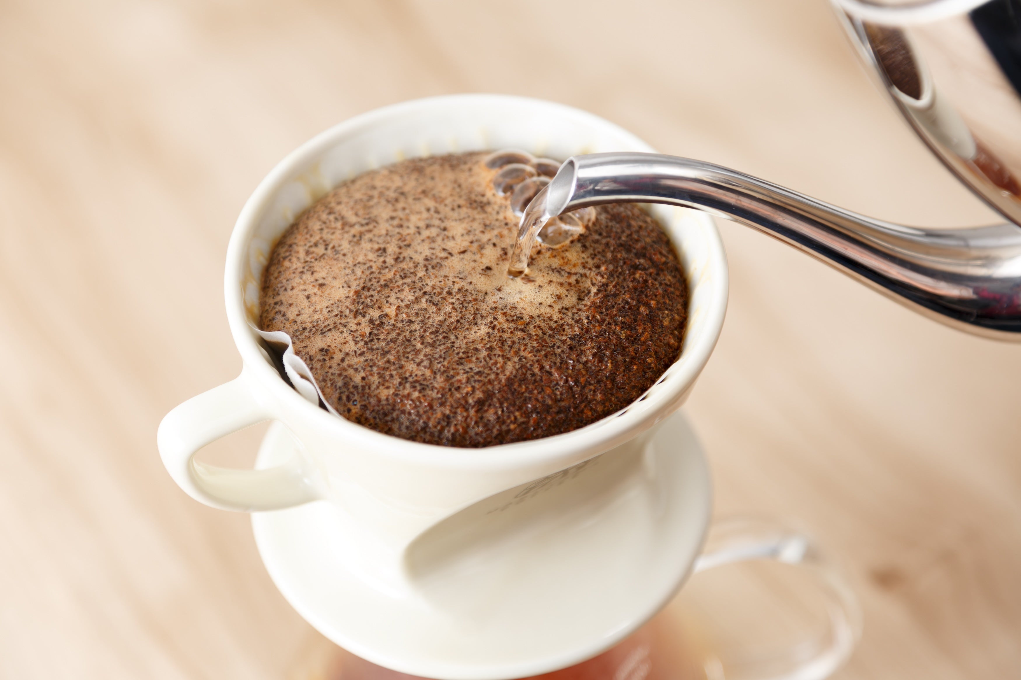 本商品は、シャープに刻まれたリブが特徴で、ドリッパーとフィルターの間に空気を取り込み、密着を防ぐよう設計されています。また、ドリッパーの性能を左右する底部のリングは、水平精度が高いためサーバーやマグの上でもがたつくことはありません。三つ穴の抽出口を均質に配置することで理想的な濾過速度を発揮します。