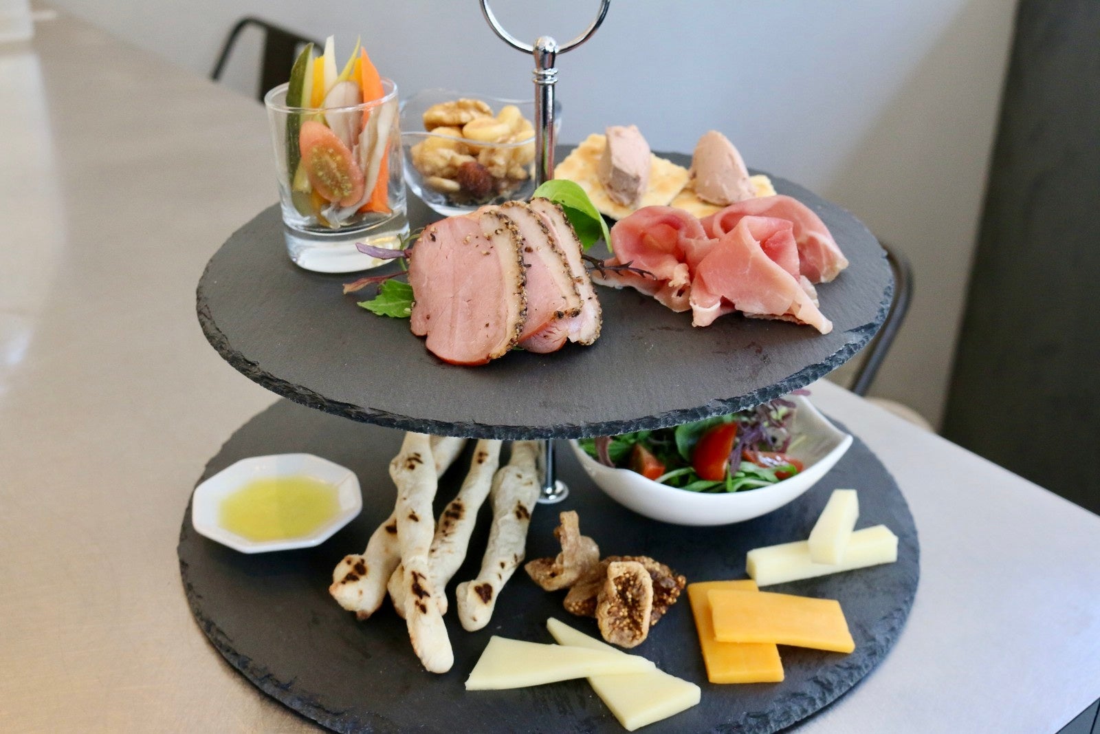 おつまみタワーはアフタヌーンティーでお馴染みのタワースタンドに、生ハム・鴨のパストラミ・レバーパテ・チーズ・季節野菜のピクルスなど10種類以上のおつまみを盛り付けたものです。