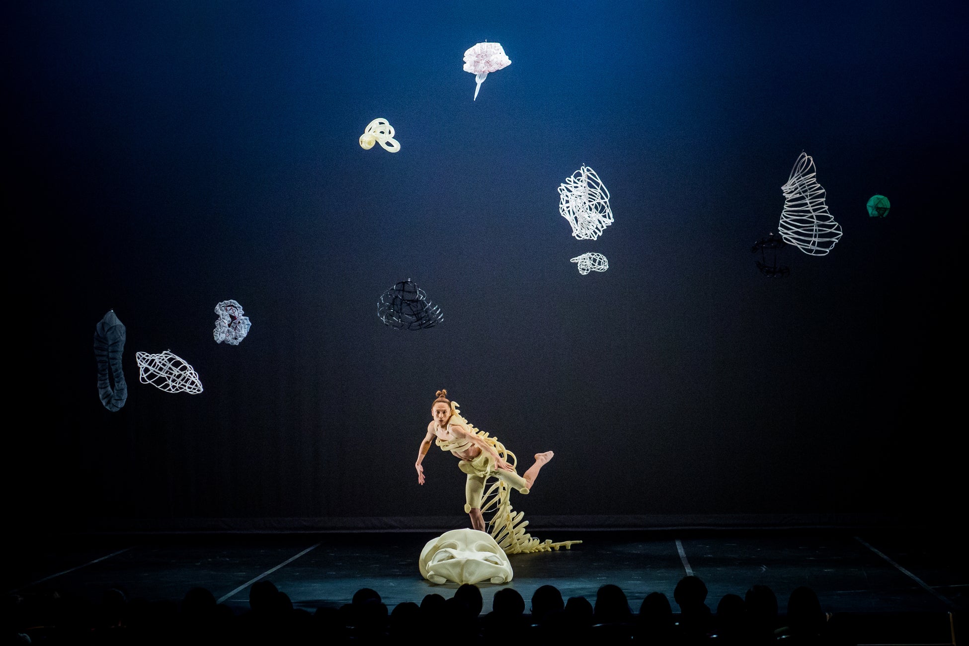 コスチューム・アーティスト、ひびのこづえは、野田秀樹演出の舞台やNHK Eテレ『にほんごであそぼ』、CM、バレエ、映画など様々なシーンで活躍。「骨」や「心臓」「膀胱」などからだのパーツを題材に衣装をつくる本公演の赤血球をイメージした特大オブジェが登場するラストシーンは圧巻です。