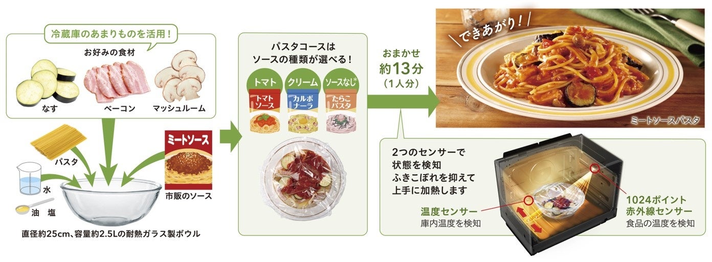 パスタなどがお好みの材料とボウル1つでできる「おまかせレンジ調理」を新搭載 「石窯おまかせ焼き」と合わせてより便利になった過熱水蒸気オーブンレンジを発売
