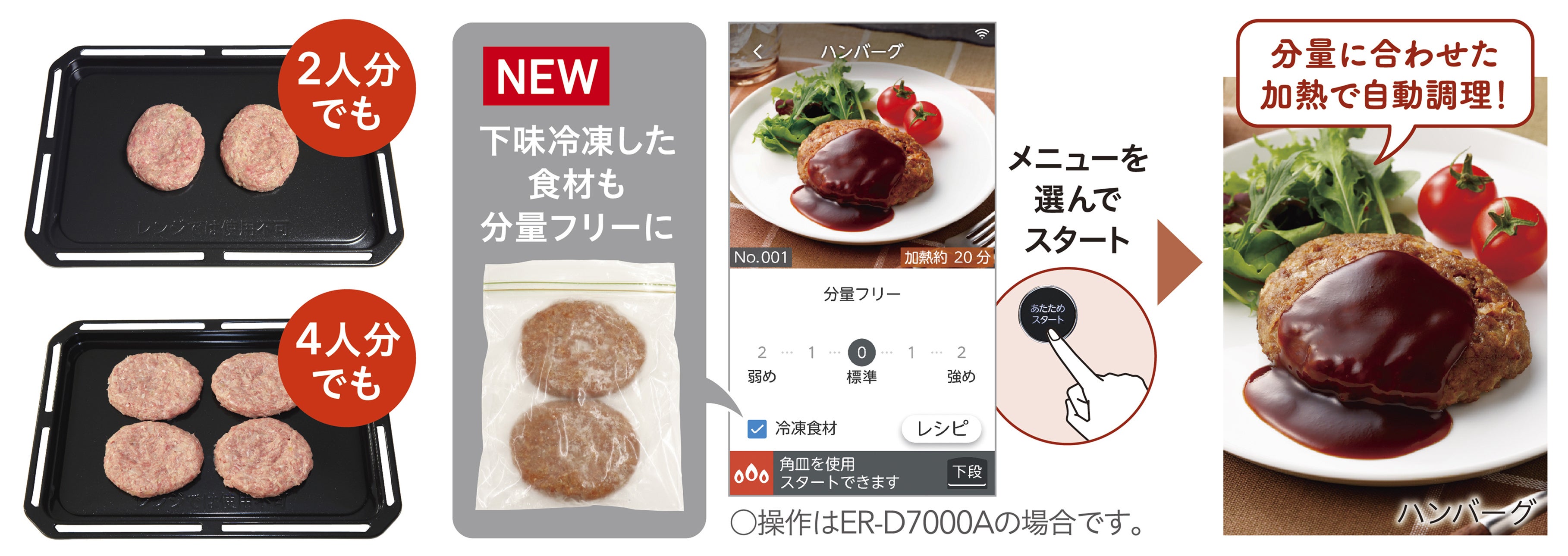 また、ハンバーグや鶏のから揚げなど、分量に合わせて加熱を自動調節する「分量フリー自動メニュー」に、下味冷凍コースを追加しました。昨今、節約・時短につながることで定着した「下味冷凍」も、解凍の手間なく調理ができます。