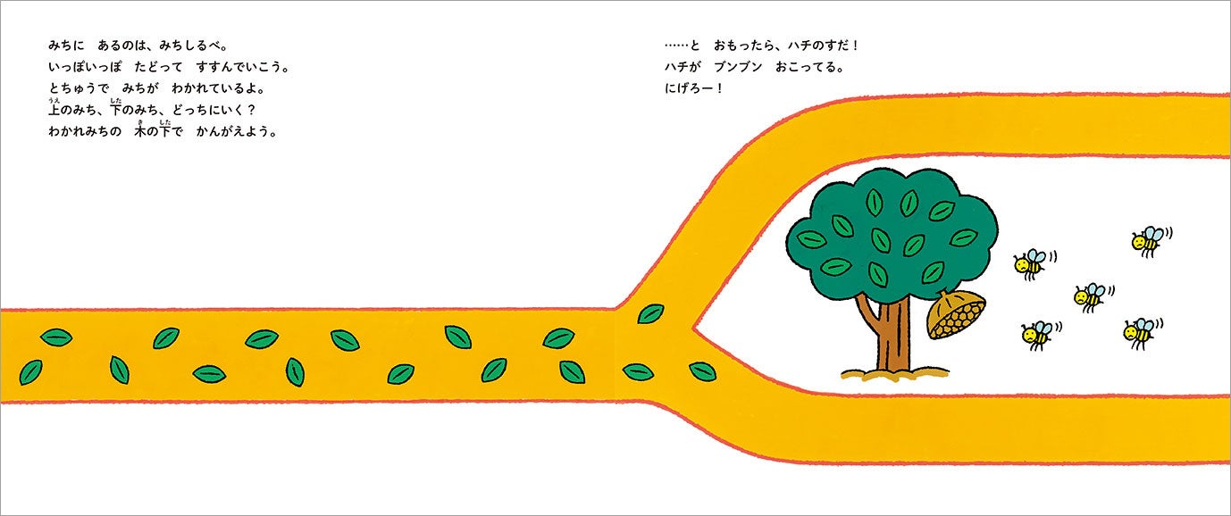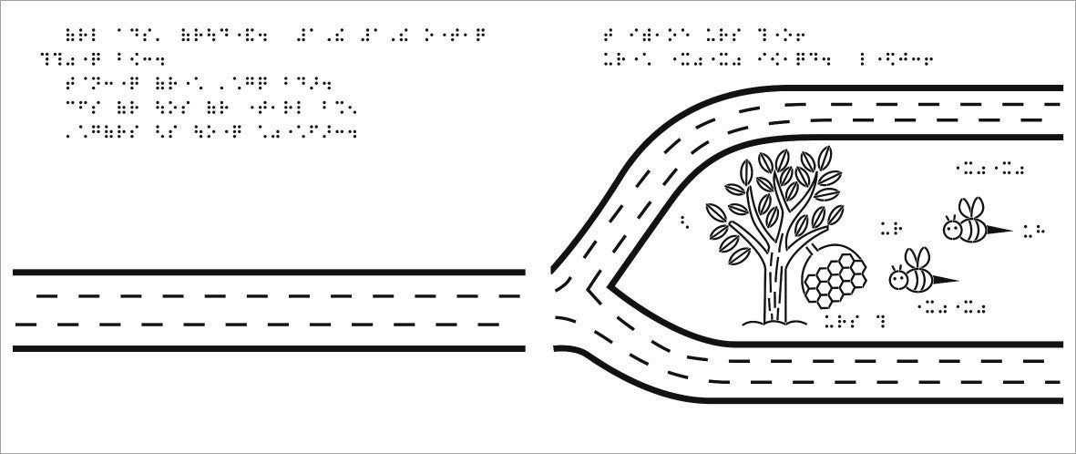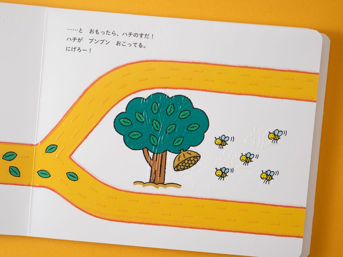 本作は、見える子も見えない子もいっしょに楽しめる、ゆびあそびの絵本です。点字や触図の隆起印刷が施されていて、目で見るだけでなく、手で触ってもイラストを感じられるつくりになっています。