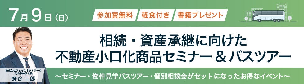 東京の城南3区エリア(世田谷区・目黒区・渋谷区)を中心に、主に新築一棟RCマンションによる不動産投資支援事業を展開する株式会社フェイスネットワーク(本社:東京都渋谷区、代表取締役社長:蜂谷 二郎、以下 「当社」という。)は、4月22日(土)に開催した株式会社オーナーズ・スタイル(本社:東京都中央区、取締役会長:福島 優)主催の『相続・資産承継に向けた不動産小口化商品セミナー& バスツアー』が大変ご好評いただいたことから、7月9日(日)にアンコール開催することをお知らせいたします。
