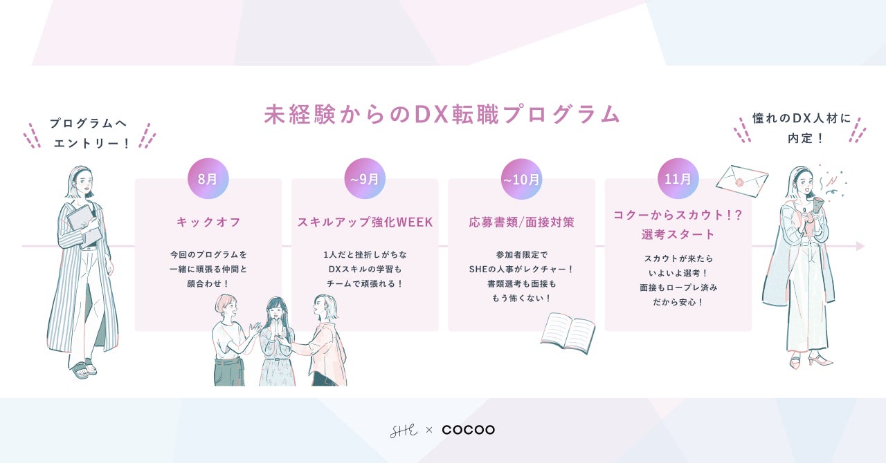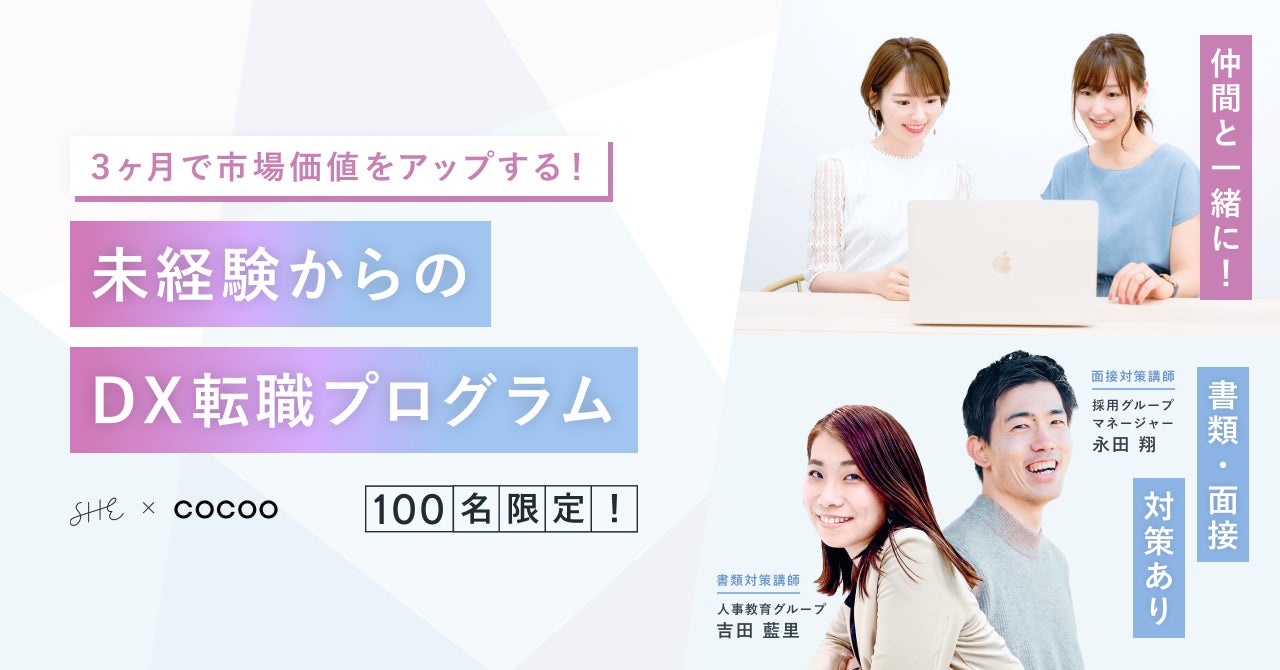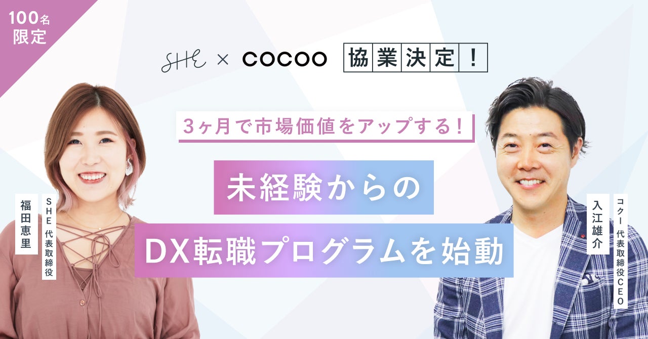 働く女性のための統合プラットフォームを運営するSHE株式会社(所在地:東京都港区、代表取締役CEO:福田恵里、以下SHE) は、コクー株式会社(本社:東京都千代田区、代表取締役社長:入江雄介)と協業し、未経験からDX領域においての就業を目指す方に向けたキャリア支援を開始します。