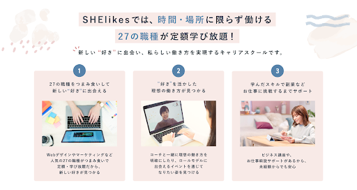 SHE株式会社は、「一人一人が自分にしかない価値を発揮し、 熱狂して生きる世の中を作る」をビジョンに据え、 2017年に創業いたしました。 主要事業である『SHElikes(シーライクス)』では、 21世紀を生きる女性たちが自分らしい働き方を叶えられるよう、 WEBデザインやWEBマーケティングなどのクリエイティブスキルレッスンやコーチングプログラム、 仕事機会を提供し、 これまでに40,000名以上に受講いただいています。2021年には、日本初・フルオンラインでトータル美容プロデュースするコミュニティサービス「SHEbeauty」と理想のキャリアや人生の実現のために不可欠なお金の知識の獲得を目指すサービス「SHEmoney」を展開しています。(SHE株式会社: https://she-inc.jp/)
