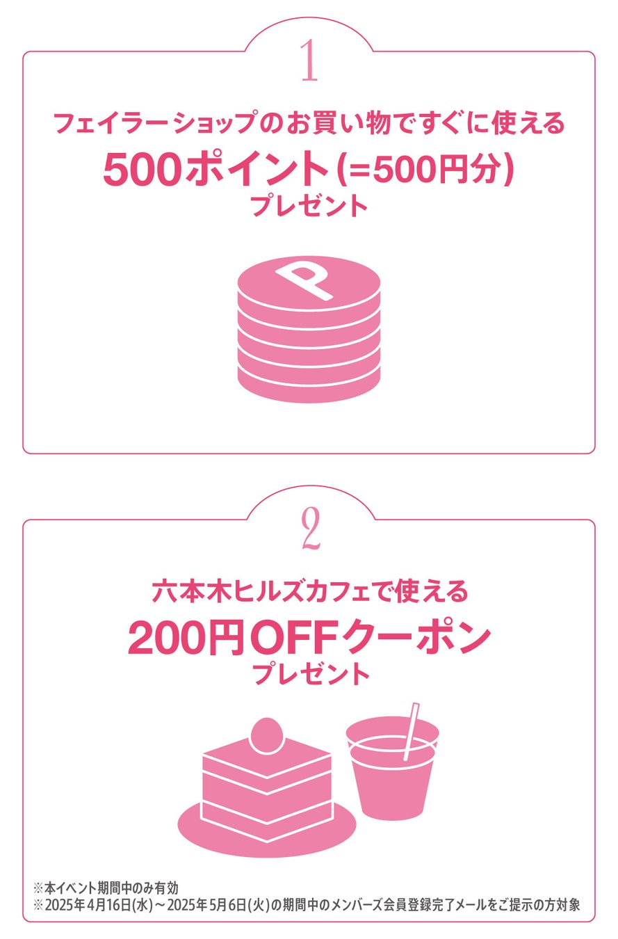 ポップアップショップ「花言葉からハンカチを贈ろう FEILER POPUP for MOM」にご来店、かつ2025年4月16日(水)~2025年5月6日(火・振休)の期間中フェイラーアプリを新規ダウンロード後フェイラーメンバーズ会員にご登録いただいた方には、イベント期間中六本木ヒルズカフェで使える200円OFFクーポンをプレゼント!