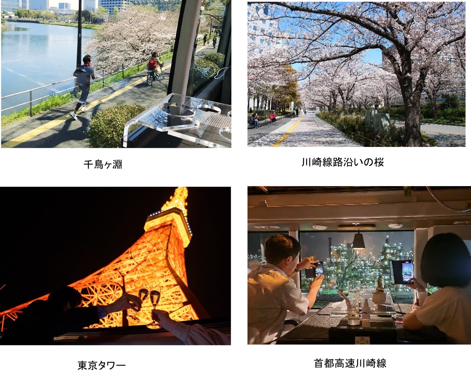 ① ライトアップされた煌めく東京タワーや川崎工場夜景に加え、桜の名所である東京の“千鳥ヶ淵”や川崎駅沿線の桜並木を一度に巡ることができます。