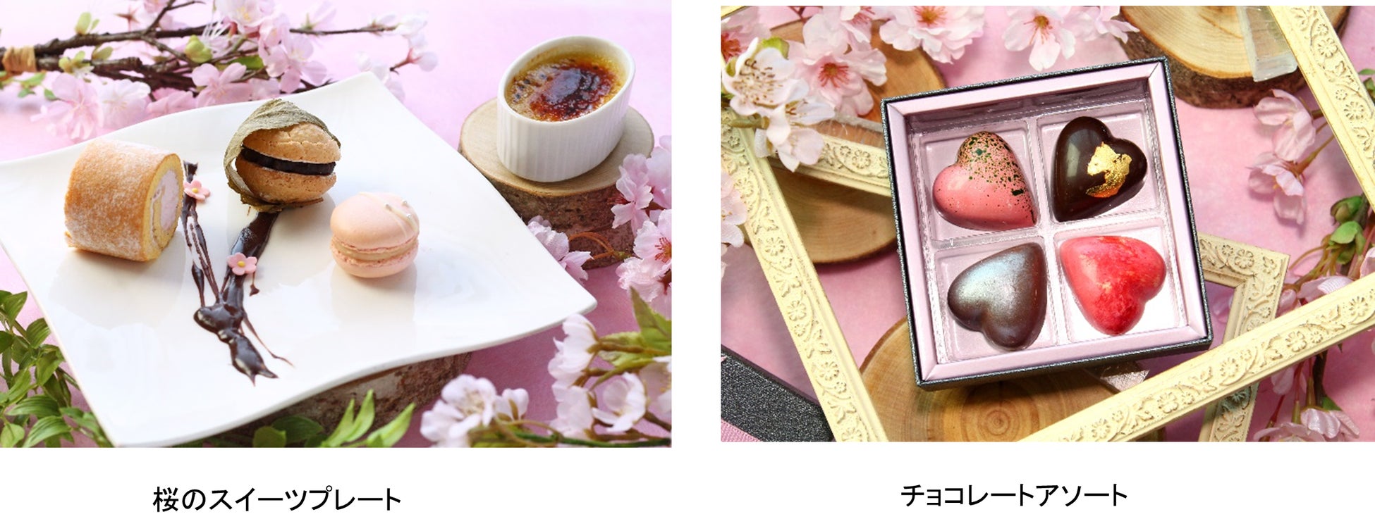 ② お花見のお供に川崎日航ホテルのエグゼクティブシェフパティシエ特製桜スイーツをお楽しみいただけます。「桜のスイーツプレート」は、自家製桜の葉パウダーと川崎産卵を使いふわふわのスポンジを焼き上げ桜のクリームを巻き込んだロールケーキに、桜香るすっきりとした甘さの白あんをサンドしたマカロン、炊き上げた北海道産小豆をサンドし桜の葉で包んだダックワーズの3種類を盛り付けた、桜づくしの春を感じる一皿です。「チョコレートアソート」は、川崎大師銘茶老舗「川崎京香園」のほうじ茶や、川崎産の苺、はちみつといった、川崎ならではの素材を取り入れたほか、工場夜景や桜をイメージしたデコレーションなど4種類のフレーバーがお楽しみいただけ、お土産としてお持ち帰りも可能です。