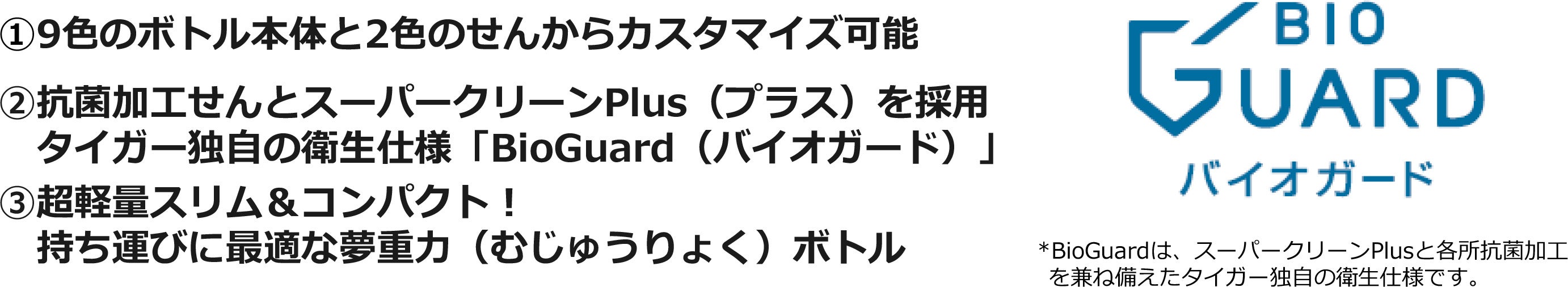 中せんはSIAA(抗菌製品技術協議会)認証の抗菌加工、ボトル内面はスーパークリーンPlus(プラス)を採用したタイガー独自の衛生仕様「BioGuard(バイオガード)」で、毎日安心して清潔にご使用いただけます。