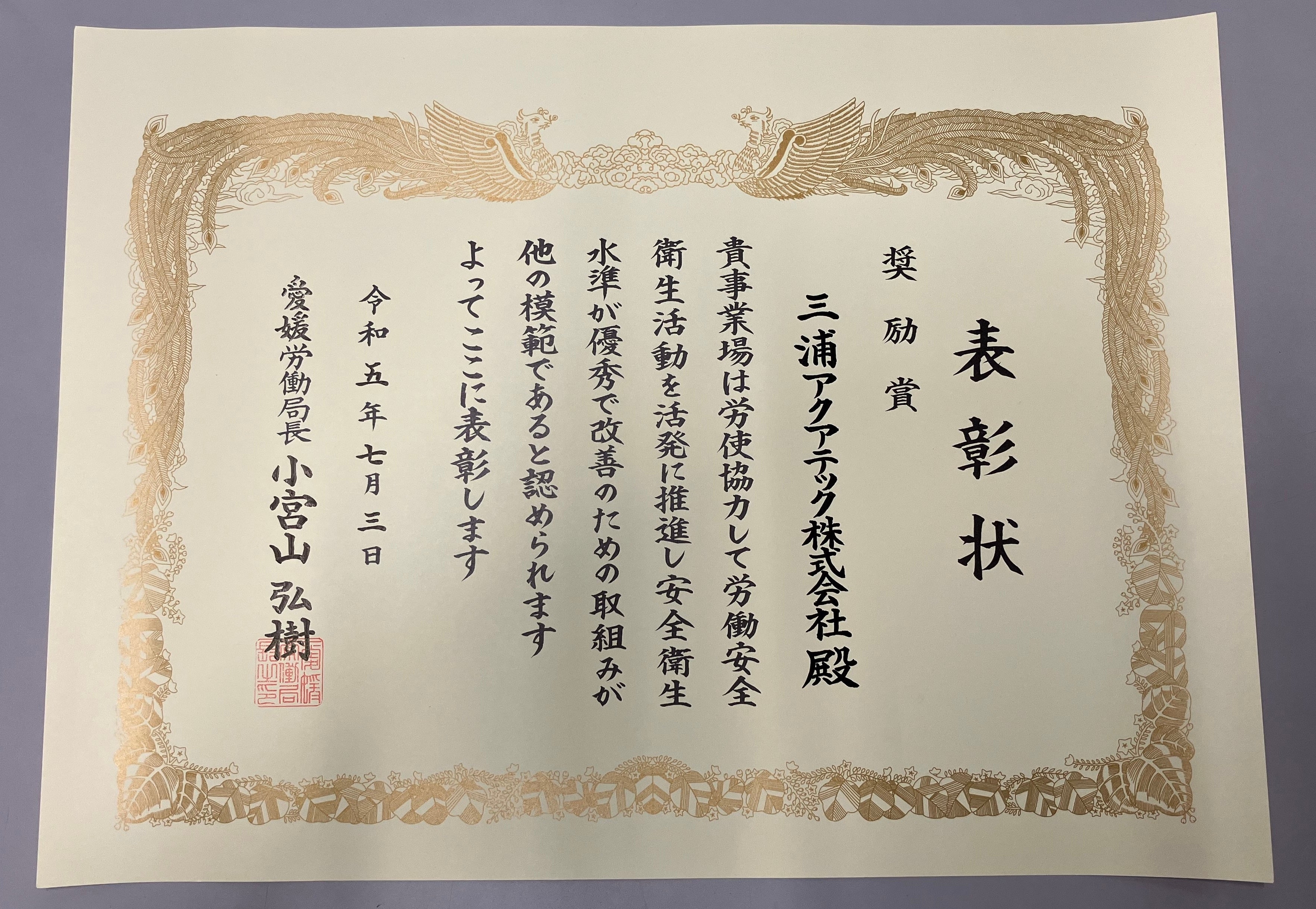 このたび授与された「愛媛労働局長表彰 奨励賞」は地域の中で安全衛生に関する水準が良好で改善のための取り組みが他の模範と認められる事業所または企業に対する表彰で、県内では2つの事業所が受賞し、そのうちのひとつが三浦アクアテックとなりました。