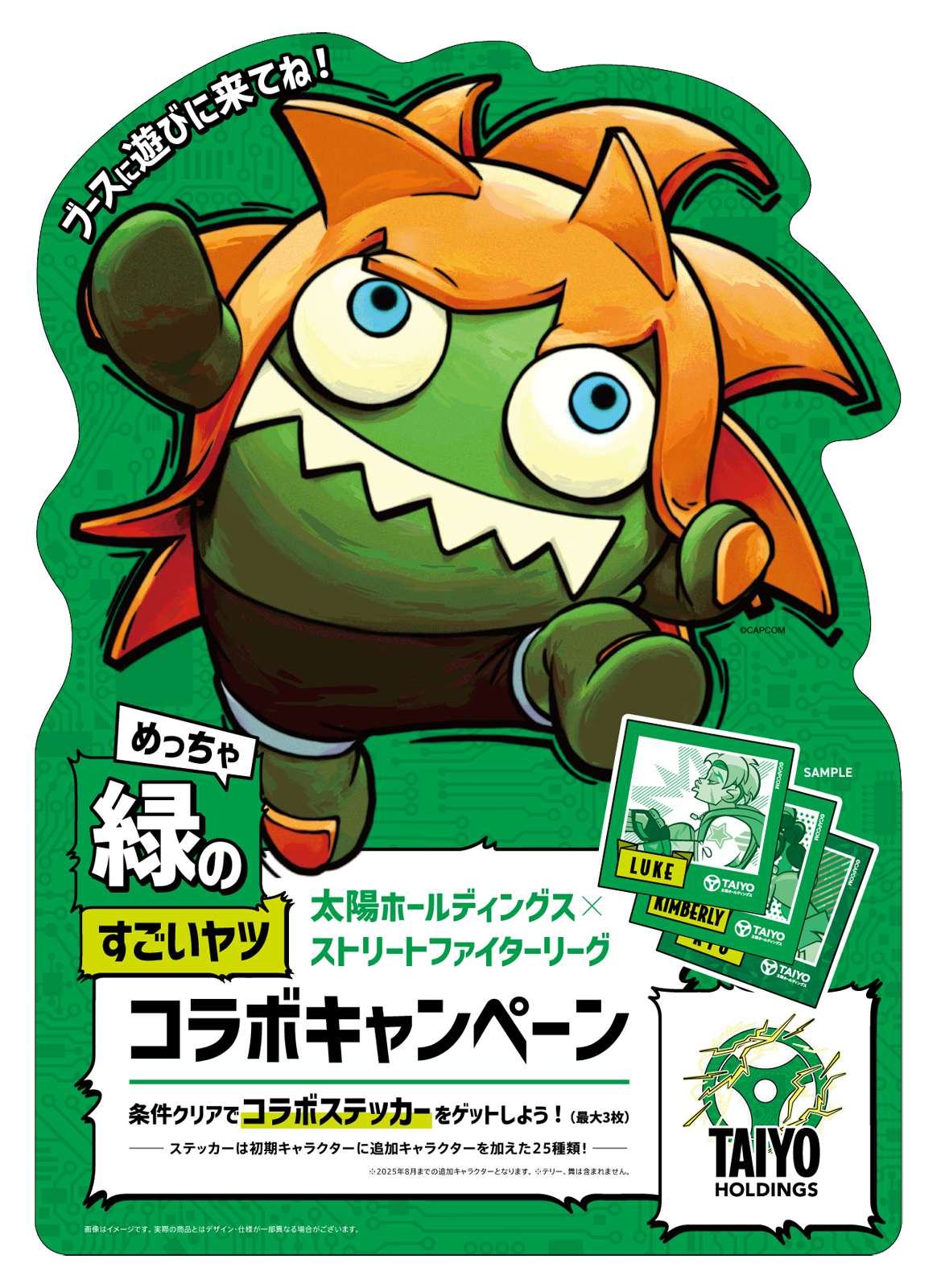 ブースでは、『ストリートファイター6』コラボステッカーを数量・土日限定で配布します。『ストリートファイター6』コラボステッカーは、太陽ホールディングスのコーポレートカラーである緑で統一した限定デザインになっており、全部で25種のキャラクターステッカーを用意しています。本ステッカーはミッションの達成に応じて配布します。ミッションは全部で3つあり、全てクリアすることで、お ひとり様最大3枚のコラボステッカーを無料で取得することができます。また、『ストリートファイター6』とコラボした太陽ホールディングスの会社案内パンフレットも数量限定で配布します。ぜひ、お越しください。