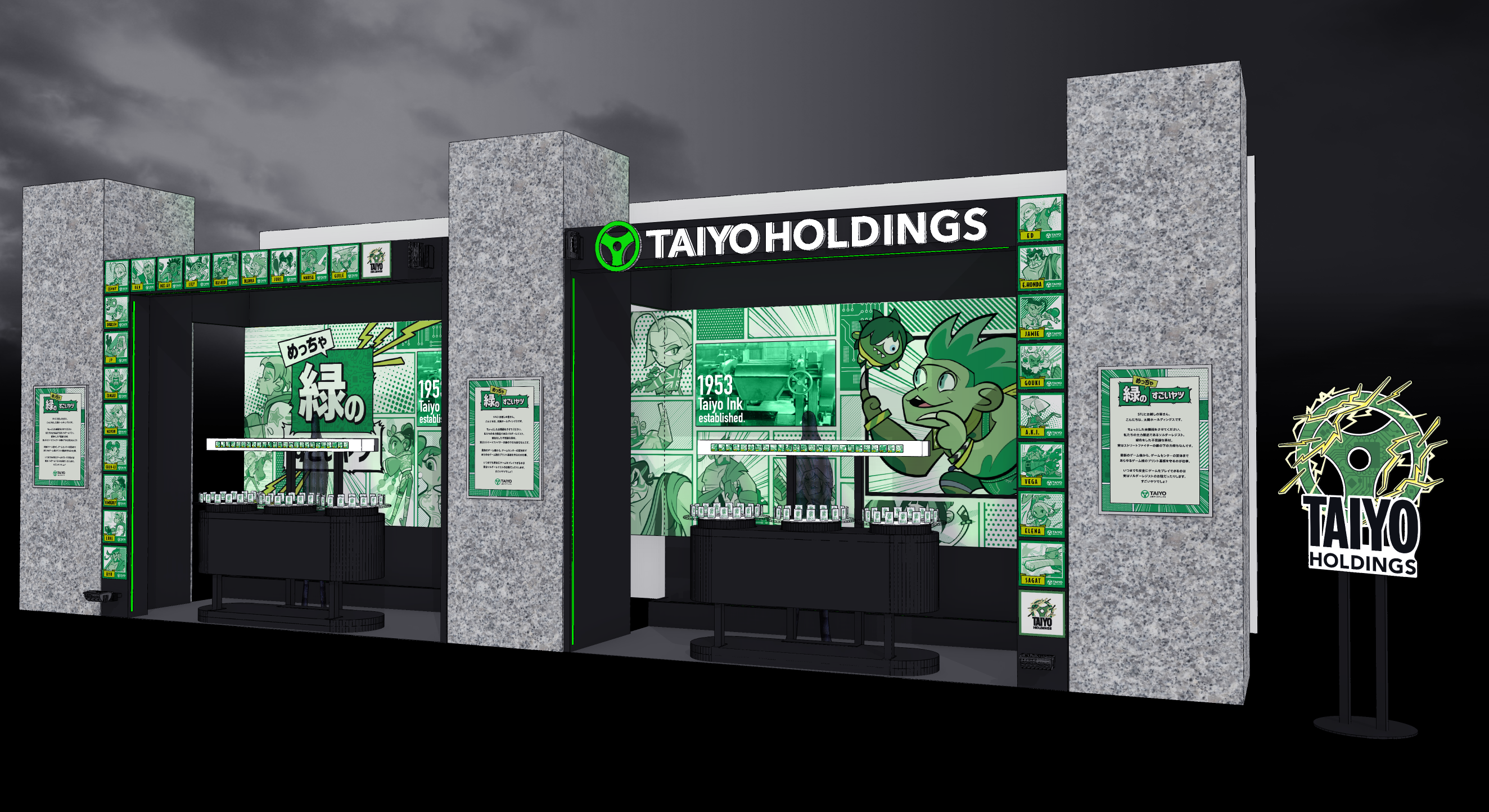 今年は、「めっちゃ緑のすごいやつ。」をコンセプトに、当社がストリートファイターリーグに協賛する理由を中心に表現しました。当社の主力製品であるソルダーレジストは、最新のゲーム機からゲームセンターの筐体まであらゆるゲーム機のプリント基板を守っています。ソルダーレジストの象徴的なカラーである緑色一色でストリートファイター6のキャラクターたちを含め、ブースをデザインしました。また、ソルダーレジストの用途や効果を動画やパンフレット、クロスワードクイズなどを用いて楽しく説明することで、当社とeスポーツの関わりを表現しました。