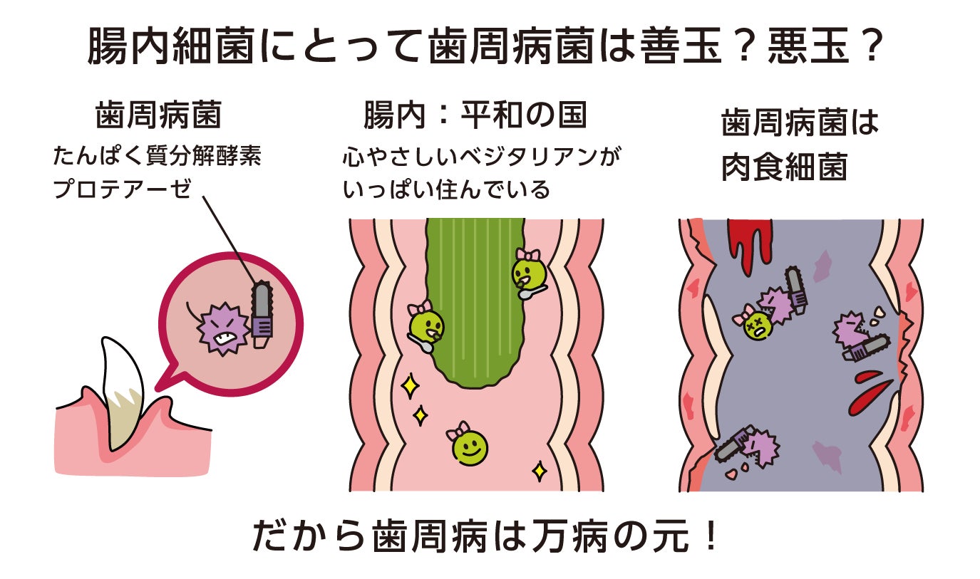 西オーストラリア大学のロビン・ウォーレン名誉教授とバリー・マーシャル教授は「ピロリ菌が胃炎や胃潰瘍の原因である」ことを発見し、2005年にノーベル生理学・医学賞を受賞しています(※3)。経口摂取したピロリ菌と胃の疾病の関係性は、本調査を通じて明らかとなった消化器経由で腸内に侵入する歯周病関連菌と全ての疾病の関係性と、同様のものであると考えられます。