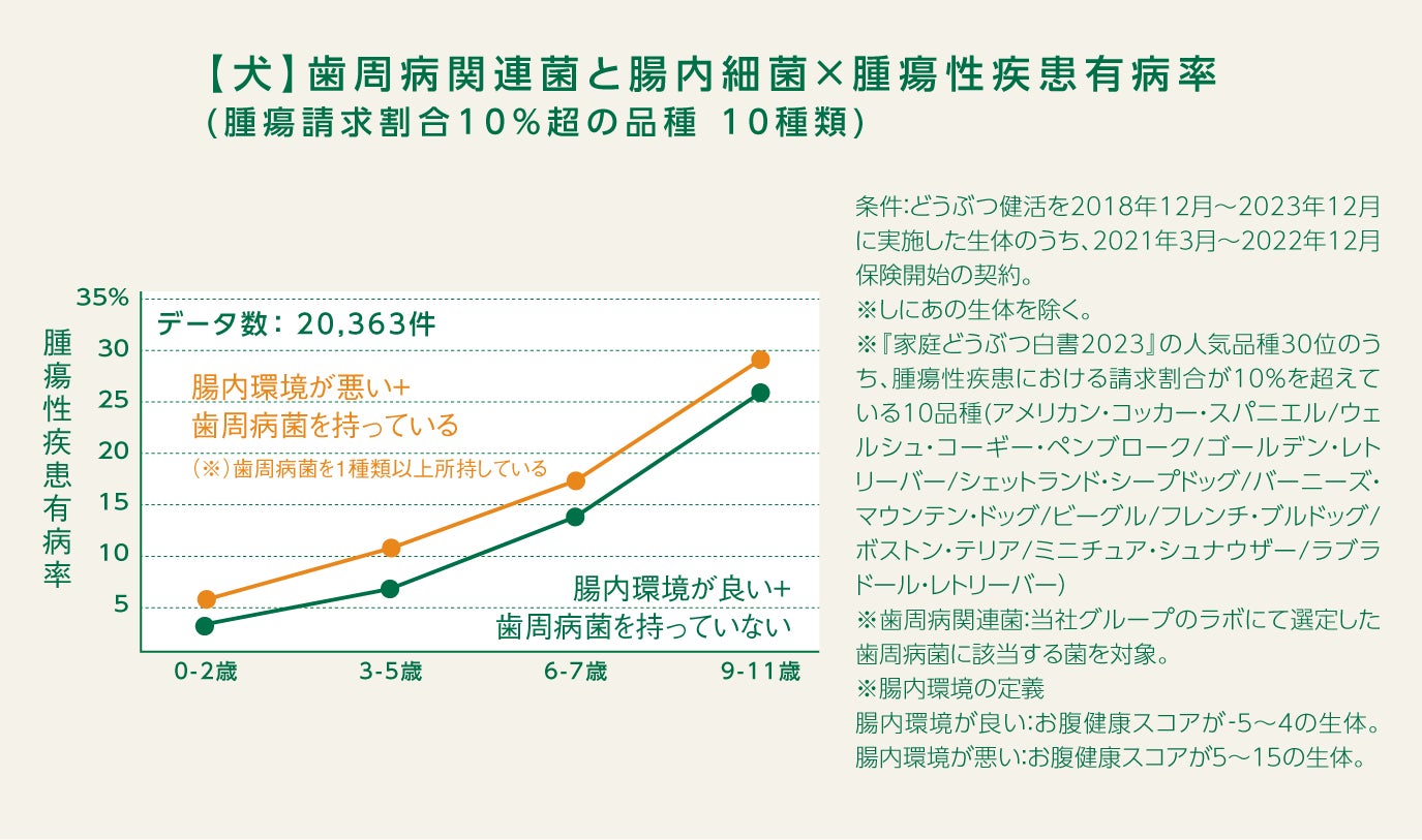アニコム損保の保険契約件数が多い上位30犬種のうち、腫瘍性疾患における請求割合が10%を越えている10犬種(アメリカン・コッカー・スパニエル、ウェルシュ・コーギー・ペンブローク、ゴールデン・レトリーバー、シェットランド・シープドッグ、バーニーズ・マウンテン・ドッグ、ビーグル、フレンチ・ブルドッグ、ボストン・テリア、ミニチュア・シュナウザー、ラブラドール・レトリーバー)の腸内環境の善悪および腸内における歯周病関連菌の有無と腫瘍性疾患の有病率の関係について調査したところ、どの年齢帯においても「腸内環境が悪い+歯周病菌を持っている群」は「腸内環境が良い+歯周病菌を持っていない群」に比べて、腫瘍性疾患の有病率が高いことが分かりました。