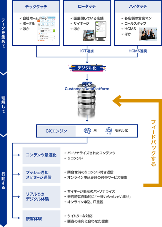 まず、当社代表が統括する「DX推進会議」を発足しました。また、社外の有識者も一緒に勉強会を行い、DXの知識をどう社内に伝えていくか社内教育の一環として様々な部署から参加してもらいました。現在は、月に2回DX推進に関する各種決定や進捗確認を「推進会議」で行い、社内でどのように進めていけば効率が良くなるかなどを、数十人規模で議論し着実に進めています。また基幹システムを2018年から作成し、データを集め、プラットフォームを解析・分析して、お客様へ提供する情報のマッチング精度の向上を進めています。