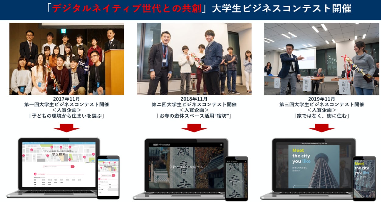 デジタルネイティブ世代の知識を入れていかないと、今後この業界はやっていけないという危機感を感じ、若い世代の方々と一緒にできることはないかと考え、2017年から「大学生ビジネスコンテスト」を開始しています。大学生ビジネスコンテストとは、大学生がチームを結成し、当社からの課題に対して、事業企画を立案するものです。その中で出たアイデア「校区・学区検索」や「ライフスタイルからの検索」などを実際に具現化することにも成功しており、世代によって知見が異なる点が大変勉強になっています。