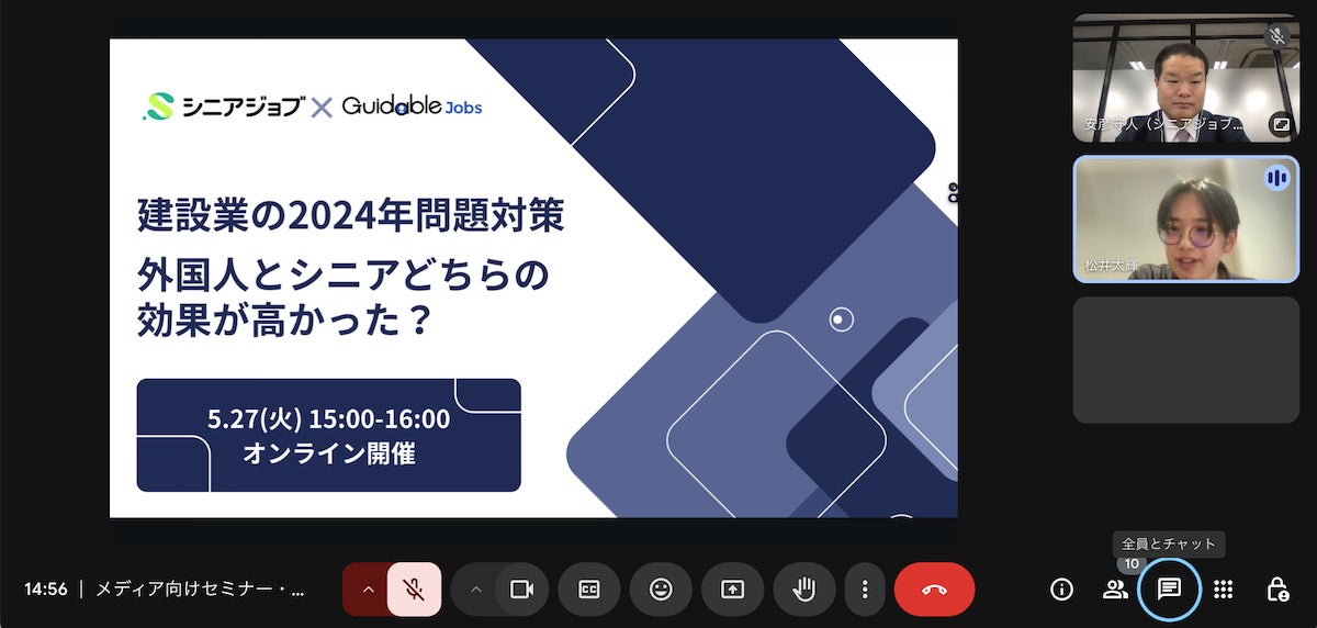 メディア向けセミナー「建設業の2024年問題、外国人とシニアどちらの効果が高かった?」において、スピーカーであるGuidable株式会社 マーケティング戦略部 マネージャー 松井太輝氏と、株式会社シニアジョブ 広報部部長 安彦守人が発表した内容を抜粋して下記に紹介します。