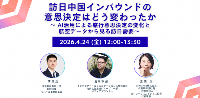 DXや訪日誘客支援、キャッシュレス決済などの分野で事業を展開するインタセクト・コミュニケーションズ株式会社(本社:東京都千代田区、代表取締役社長:譚 玉峰、以下当社)は、一般社団法人日中ツーリズムビジネス協会が2026年4月24日(金)に主催するオンラインセミナーに協力し、当社社員が登壇することをお知らせします。