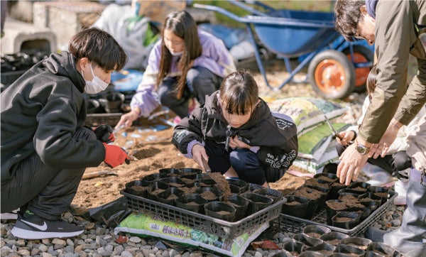 砂川の在来種を守り育てる「種ワークショップ」で市民の皆さんと種から拾い育てた苗を植えたり、広場も芝生ではなく、自生している在来種の草を残したりと、この地にある自然と共存する屋外環境をつくっていきます。化粧品の素材処理やカフェから出る生ごみからつくった堆肥を使って土づくりにも挑戦し、畑で野菜つくりも。施設からの排水を溜めて自然の浄化作用でより綺麗にしてから石狩川に流す浄化池も設置します。