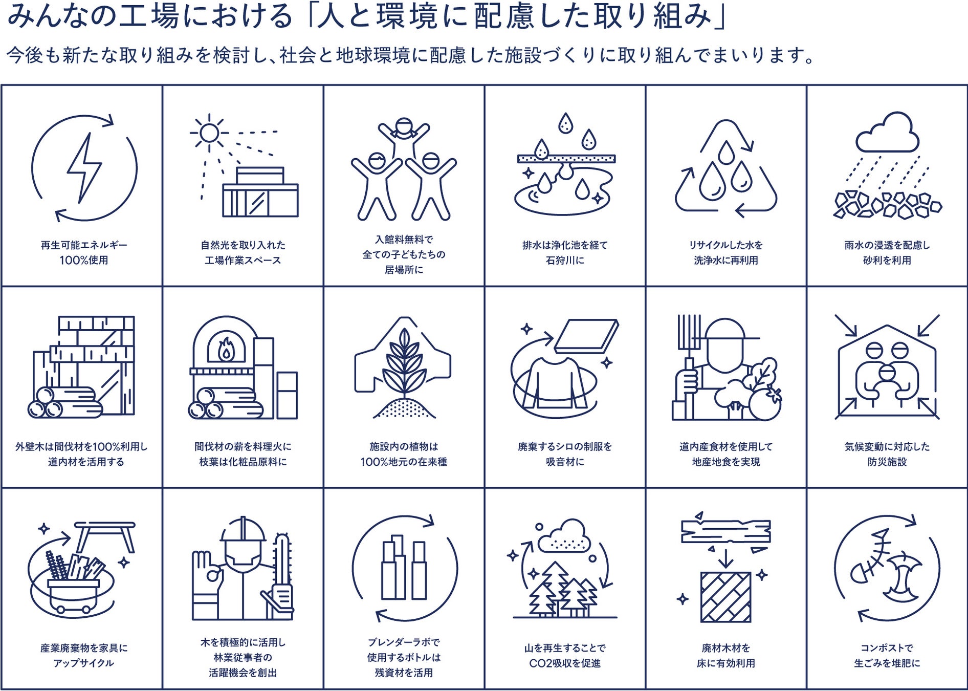 「みんなの工場」の建設・運営においても、地域社会にも地球環境にも配慮した循環型の施設を目指し、下記の目標のもと取り組んでまいります。