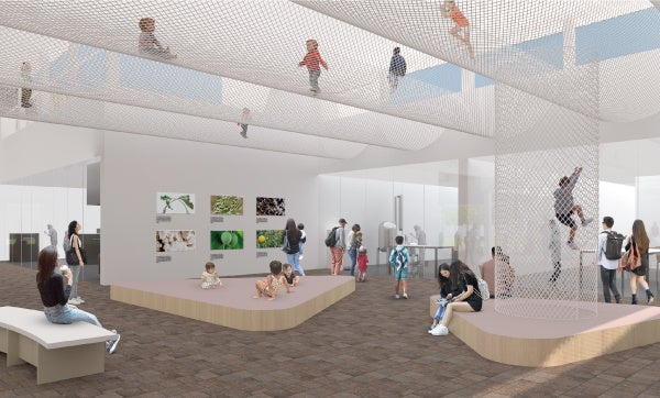 天井部分にジャングルネットを張るキッズスペースは、大人も子どもも共に過ごせるよう設計されています。自由に動き回ることができるネットの上は、子どもたち向けの空間でありながら、地上から大人がその様子を見守ることができます。ご家族で一緒に訪れても、子どもたちだけで遊びに来ても、それぞれの時間を安心して楽しくお過ごしいただけます。さらに、子どもたちの遊ぶ声が響きすぎないよう、天井には店舗スタッフの古いユニフォームをアップサイクルしてつくられた吸音材を設置しています。