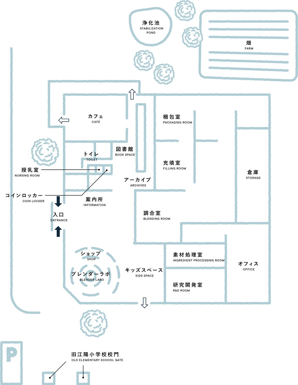 「みんなの工場」には、SHIROの製品を製造する工場に、ショップ、カフェ、キッズスペースとラウンジなどを併設した、人と環境に配慮した循環型の施設です。SHIROのものづくりをすべて見ていただけるよう、壁ではなくガラスで仕切り、「工場を開く」ことを実現いたしました。ショップ内のブレンダーラボではご自分のオリジナルの香りを実際の工場と同じ製法でつくれる、ものづくり体験が楽しめます。ピンネシリの山々を望みながらゆっくりと過ごせるカフェやラウンジ、子どもたちの自由な遊び場や、小さな図書館も完備しているこの場所が世界中のみんなの居場所になることを願っています。