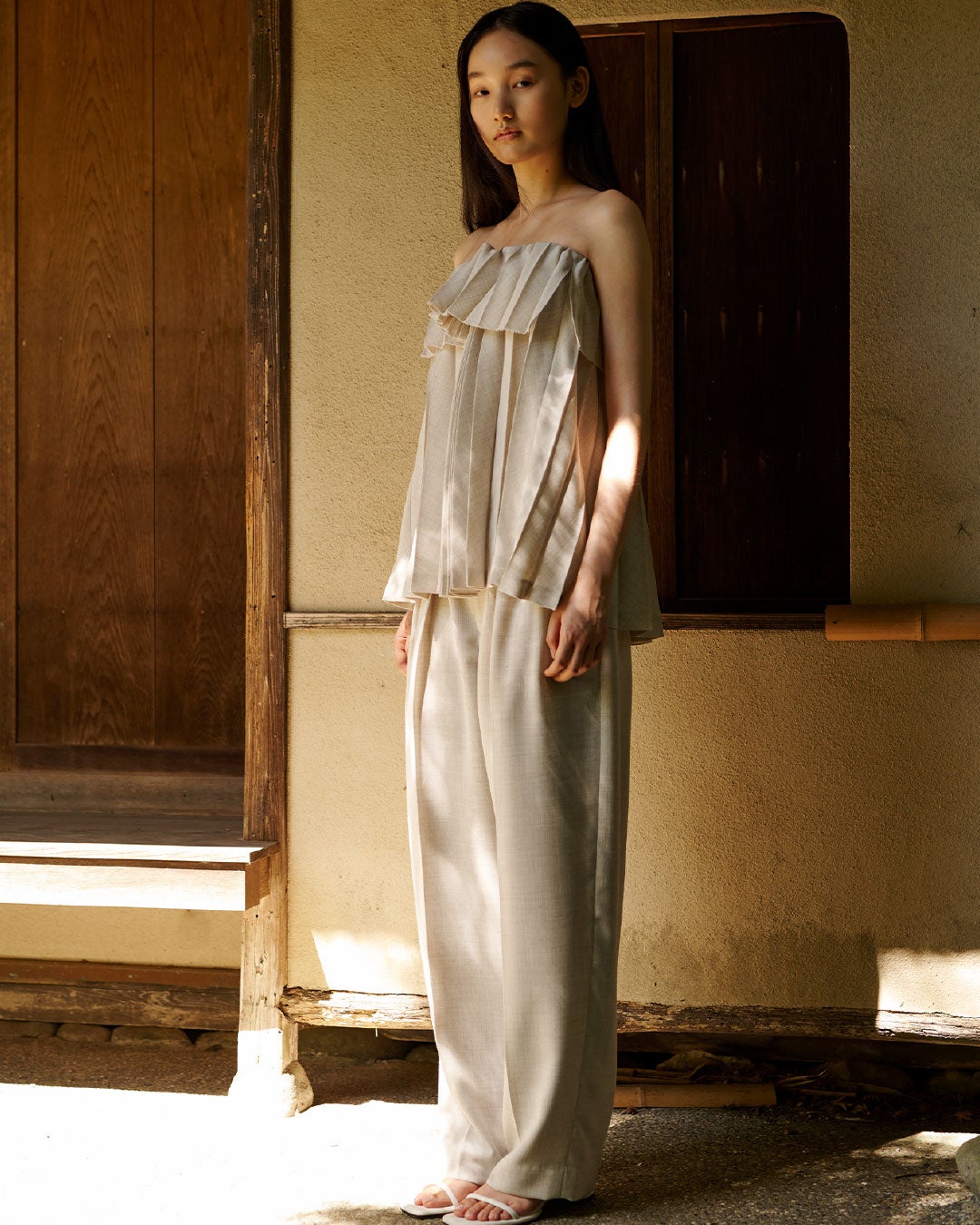和傘のイメージから生まれた、総プリーツのベアショルダーブラウス。折り返しとプリーツの束がポイント。ややAラインに広がる動きのあるヘムラインでワイドパンツやIラインのスカートなどに合わせるのがおすすめです。